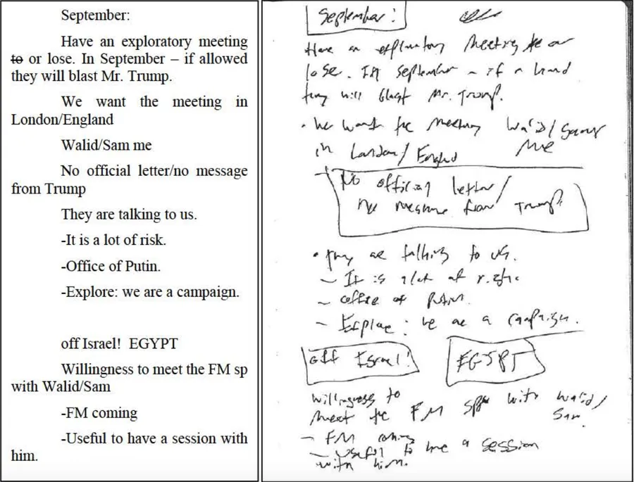 After the meeting, Nader would text Dmitriev that he had just met with “key people within the family and inner circle”, and that they spoke positively about Dmitriev. Nader told Dmitriev to send his bio to pass along, and Dmitriev sent him a two page biography, and a list of positive quotes about Trump.