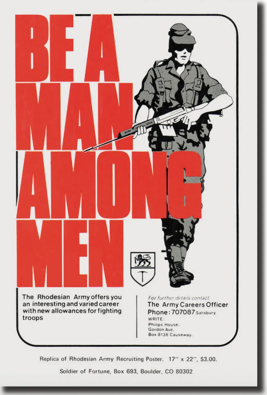An ad ran in the popular magazine Soldier of Fortune back in the 80's. Source: https://vvaveteran.org/32-2/32-2_rhodesia.html