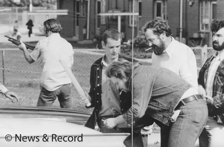KKK members take weapons from the back of a car prior to the shooting between them and members of the Workers Viewpoint Organization/Communist Workers Party on Nov. 3, 1979.