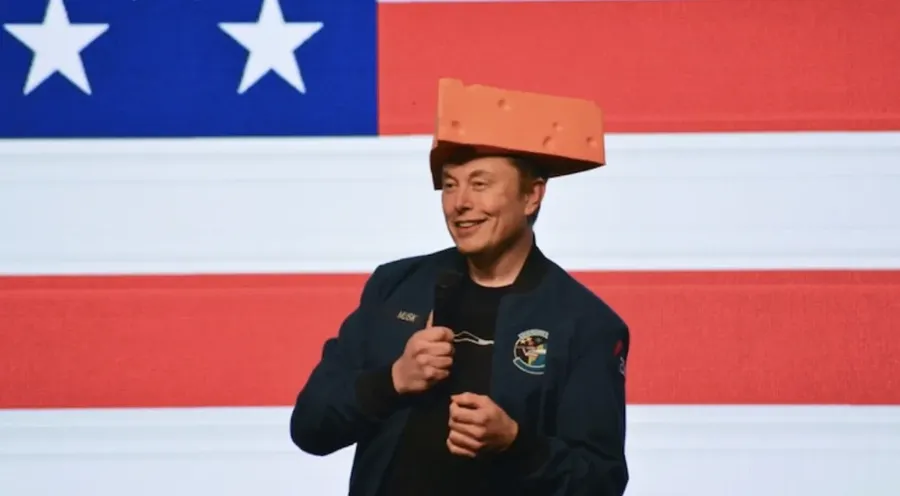Elon Musk wears a cheesehead hat as he speaks during a town hall in Green Bay, Wisconsin on March 30. © AFP.