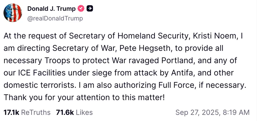 On September 27th, Donald Trump posted on Truth Social that he was directing Pete Hegseth to send troops into Portland. “I am also authorizing full force, if necessary,” he wrote. His justification? He characterized Portland as “war-ravaged” and claimed that ICE agents were under attack—a narrative that has become increasingly popular in the wake of the assassination of Charlie Kirk. At the time of this announcement, details of the deployment—including when it would take place—were not provided.