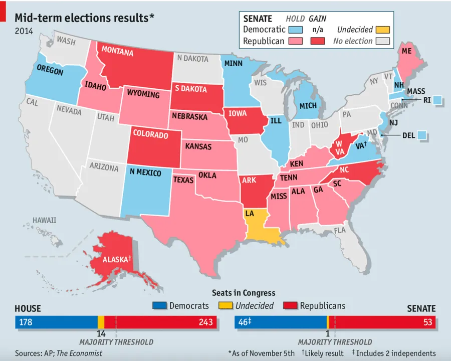 So, what changed between 2009 and 2014? How did Obama, whose feats included steering the nation through the Great Recession and signing the Affordable Care Act into law, end up with a Congress that had overwhelming Republican influence? Don’t incumbents typically have an advantage in elections?