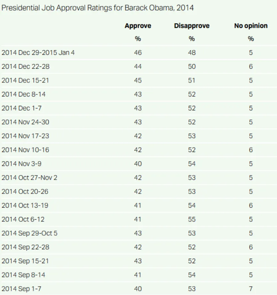 President Obama’s approval rating was consistently poor at that time, with some polls showing it as low as 40% in the weeks leading up to the election. Upon closer inspection, voters were particularly disgruntled with the state of the economy, the administration's handling of immigration , and the failed rollout of the Obamacare website.