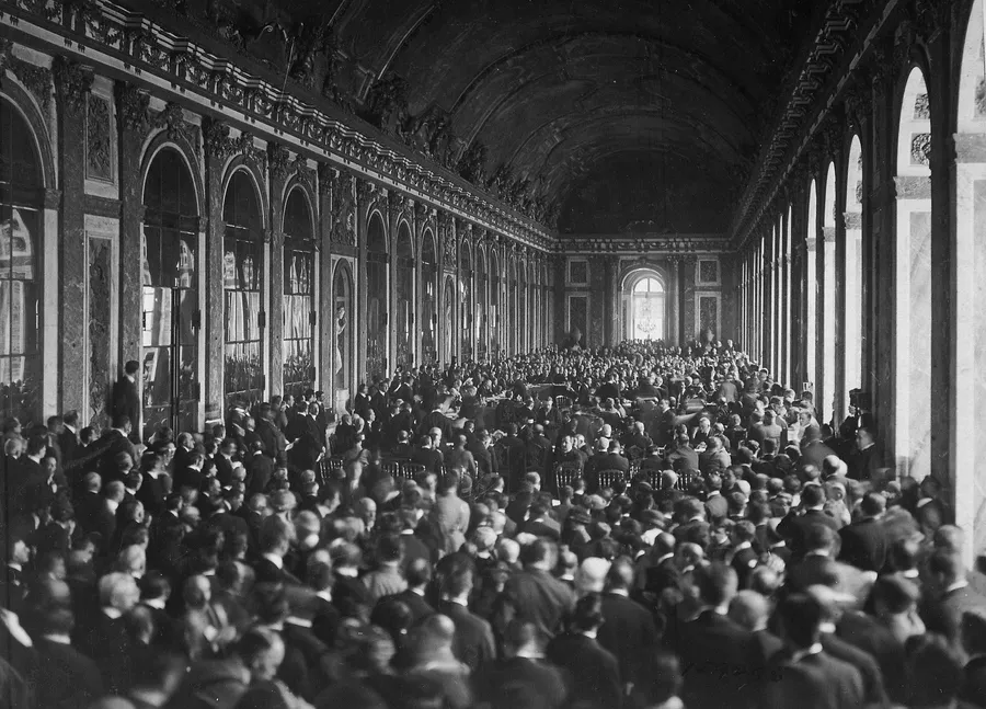 The delegations signing the Treaty of Versailles in the Hall of Mirrors.