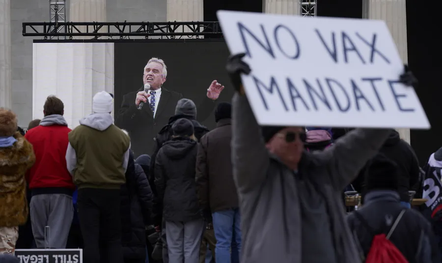 Robert F Kennedy Jr is broadcast on a large screen as he speaks during an anti-vaccine rally in front of the Lincoln Memorial in Washington DC
