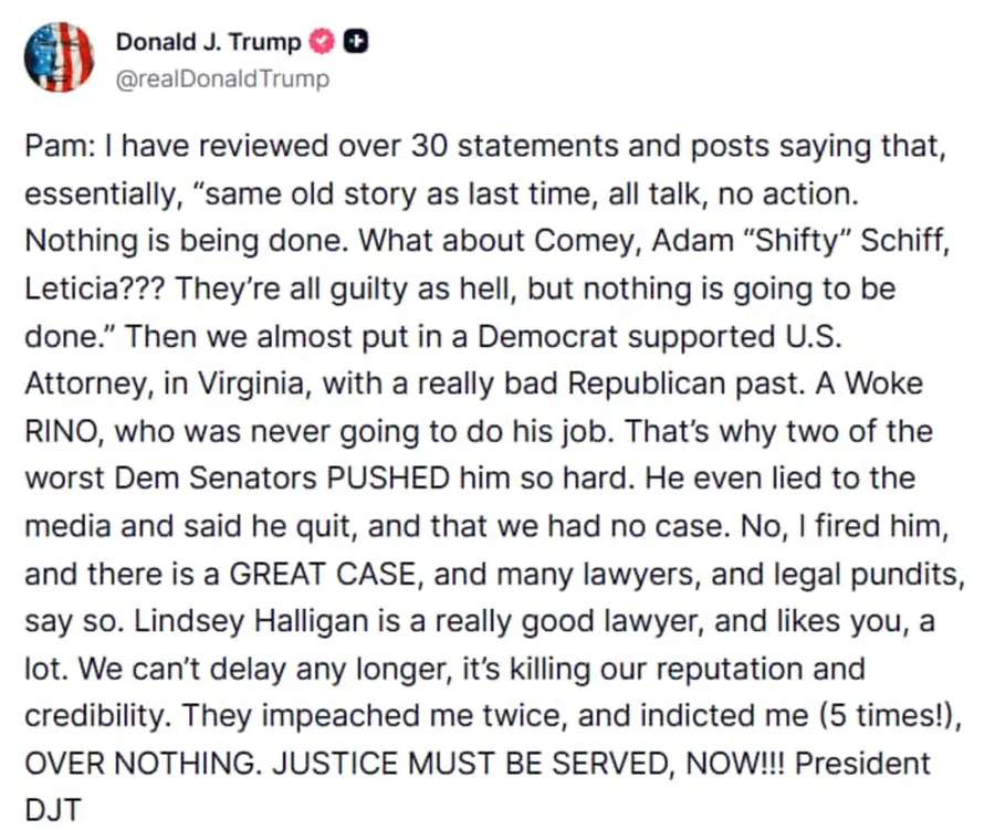 On October 24, 2025, Trump posted again on Truth Social calling for more indictments: