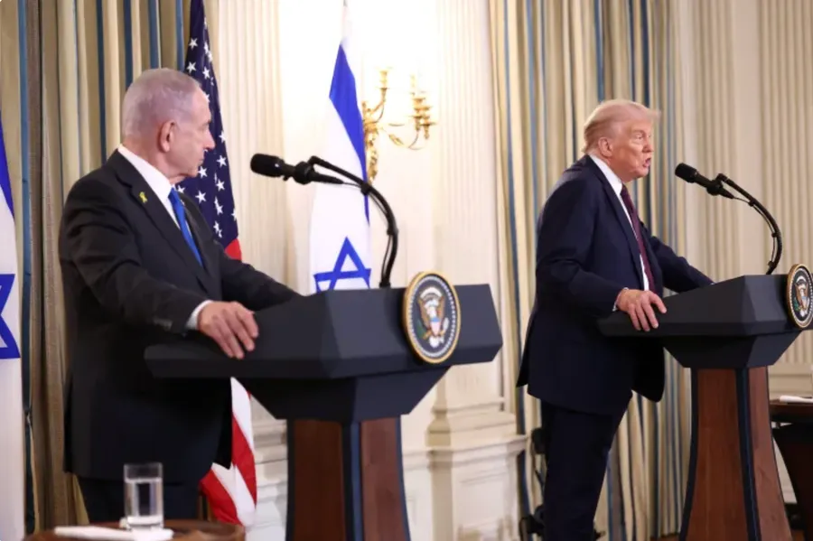 US President Donald Trump, right, and Israeli Prime Minister Benjamin Netanyahu hold a news conference in the State Dining Room at the White House in Washington, DC, on September 29, 2025 [Kevin Lamarque/Reuters]