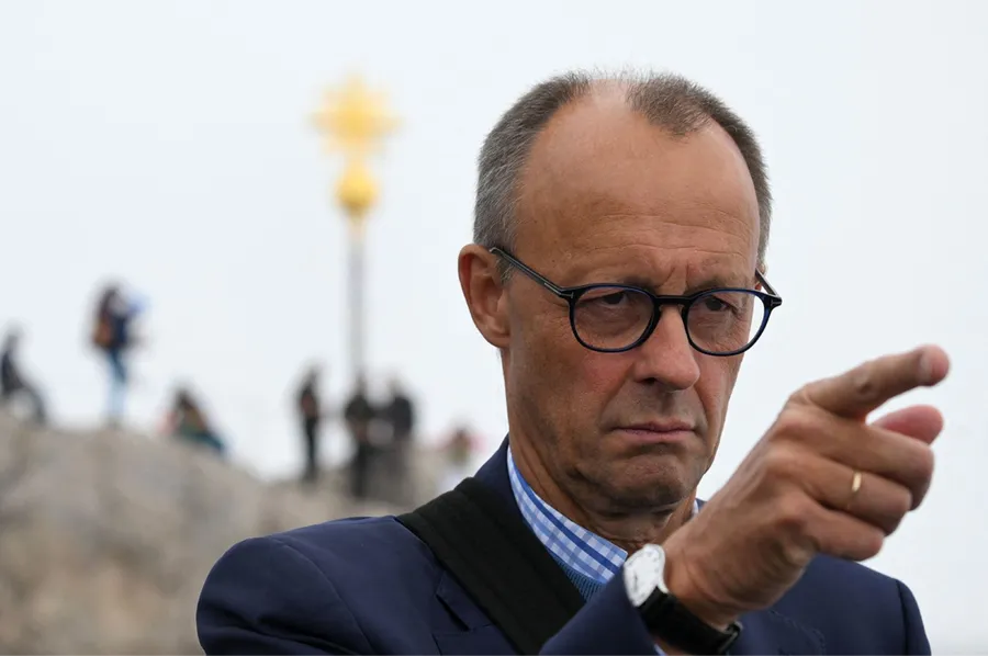 Friedrich Merz gestures during an interview in front of Germany's highest mountain, Zugspitze, before the conference of the Christian Democratic Union party on Sept. 1, 2022. Christof Stache/AFP via Getty Images