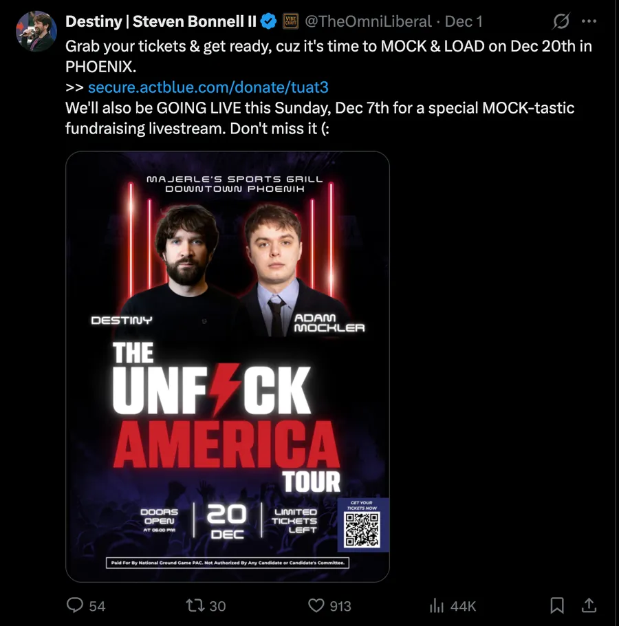 Unfuck America, Destiny, and Adam Mockler are doing a fundraising livestream today! Swing on by and show your support!